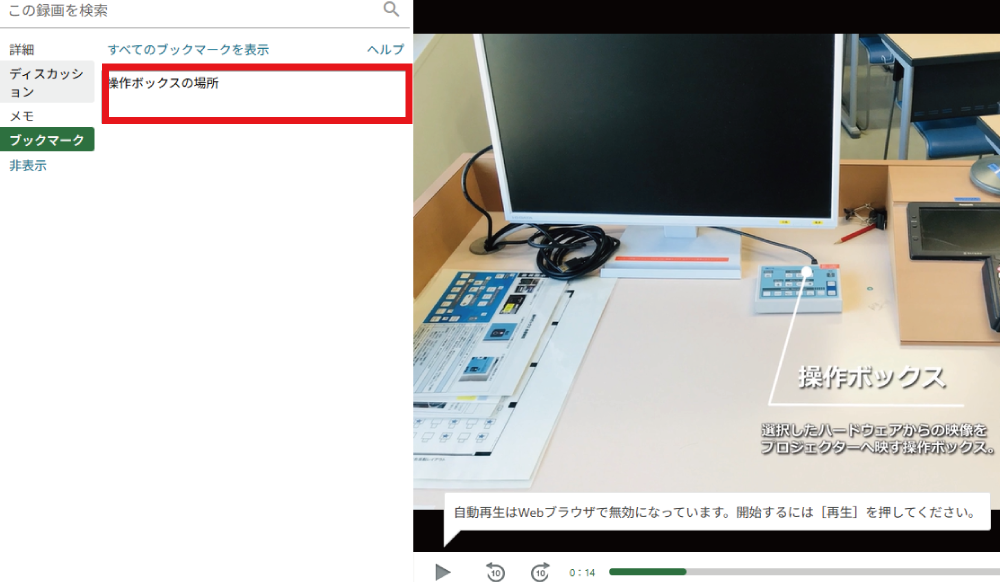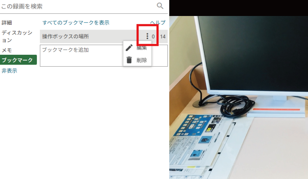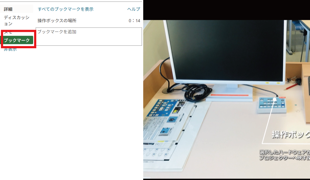 任意の動画を再生した際、左側のメニューからブックマークを選択します。