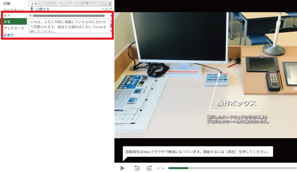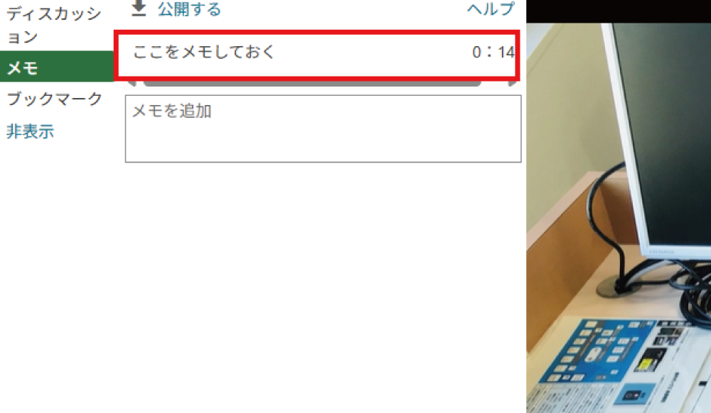 任意の動画を再生した際、左側のメニューからメモを選択し、 入力したいポイントで追加します。