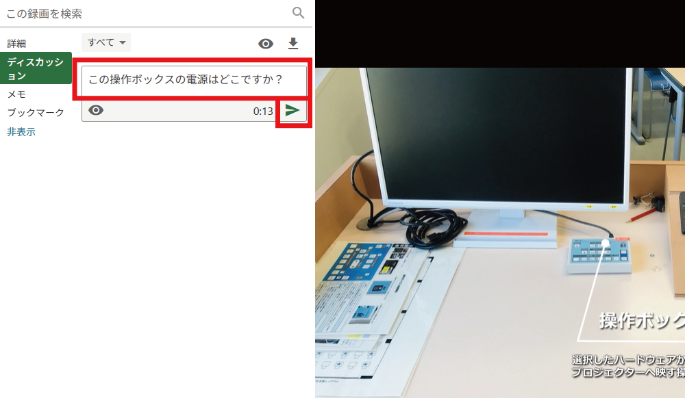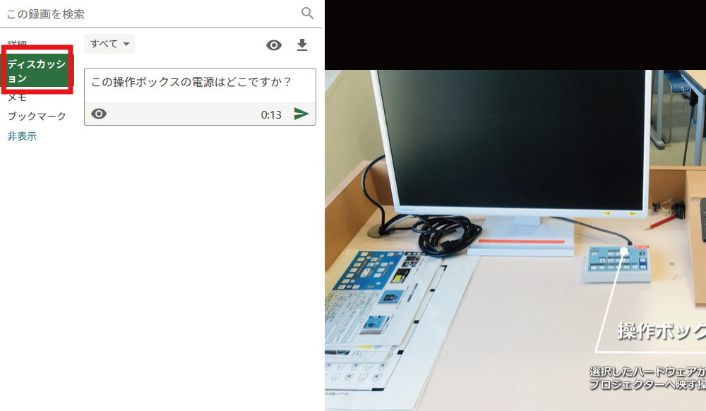 任意の動画を再生した際、左側のメニューからディスカッションを選択します。