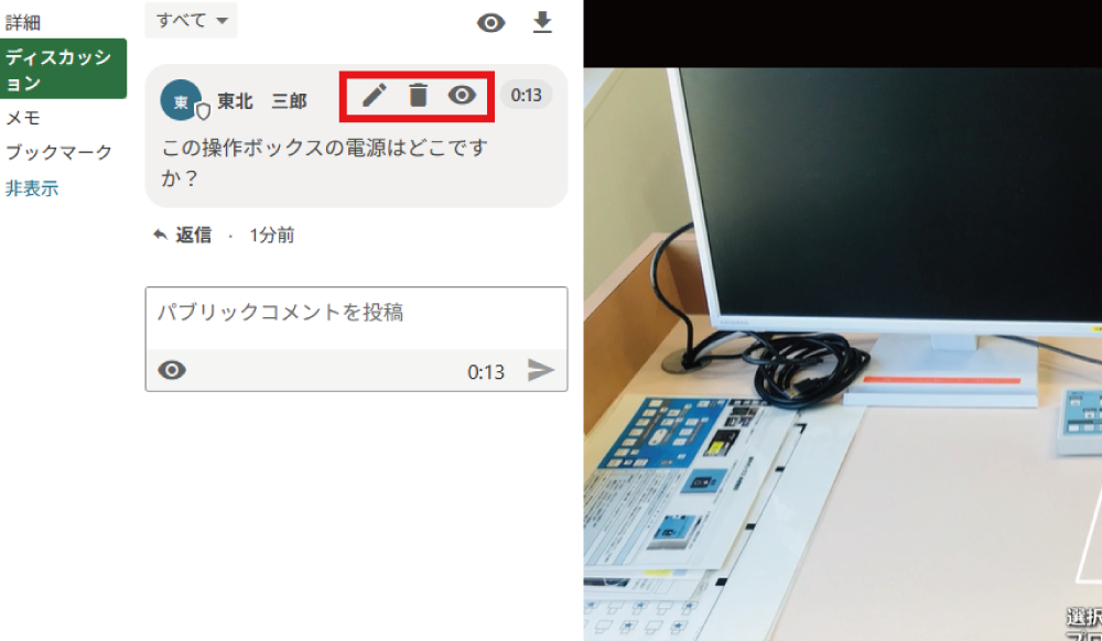 ブックマークしたいポイントで動画を止め、コメントなどを入力してエンターを押下します。入力した内容がブックマークの目印になります。