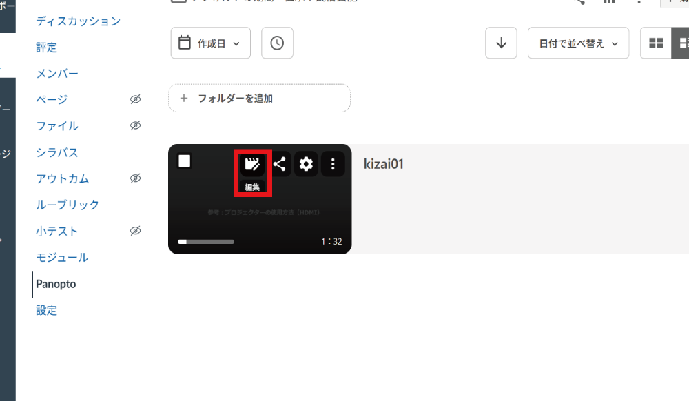 クイズを出したい動画の「編集」をクリックします。