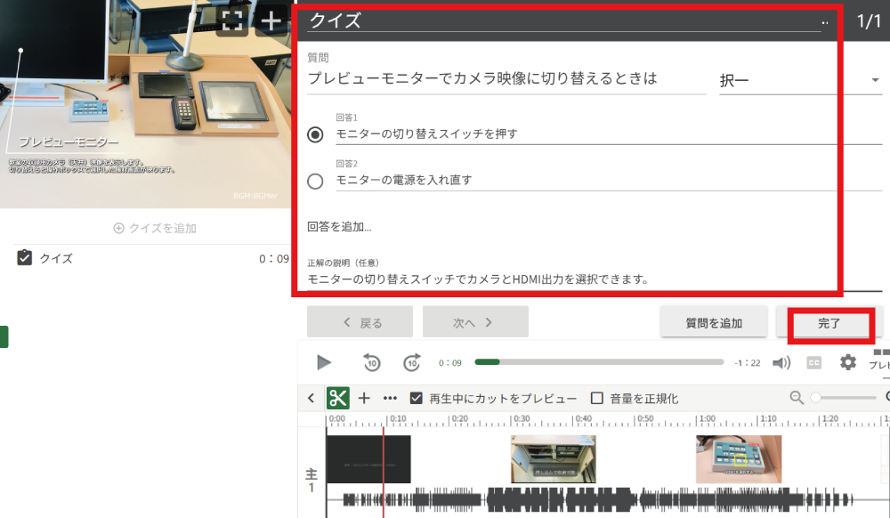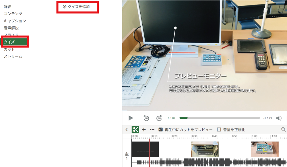 「クイズ」を選択し,クイズを挿入したいところで再生を停止し「クイズを追加」をクリックします。